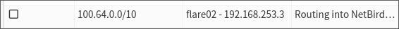 NetBird runs a network somewhere in the 100.64.0.0/10 range, so if you don’t have other networks in this range, you can route any traffic from this range into your routing peer and have it sent to NetBird. If you want to be more specific, NetBird uses a /16 network inside this range. You can find this by checking the NetBird IP of any of your devices. It will look like 100.xxx.yyy.zzz. To route specifically to this network, your network address should be 100.xxx.0.0/16.